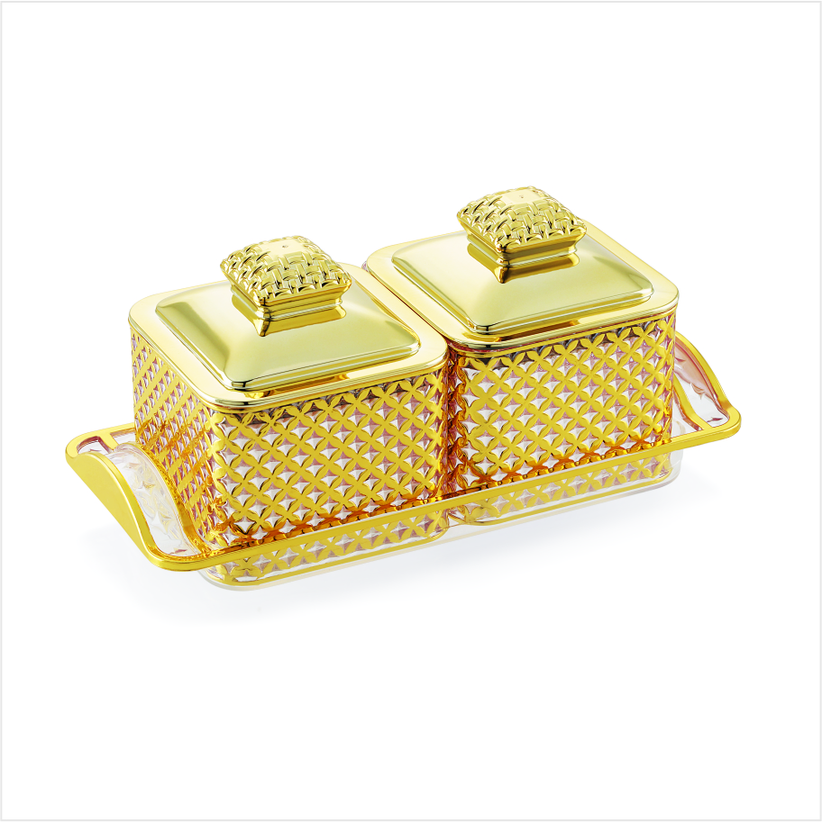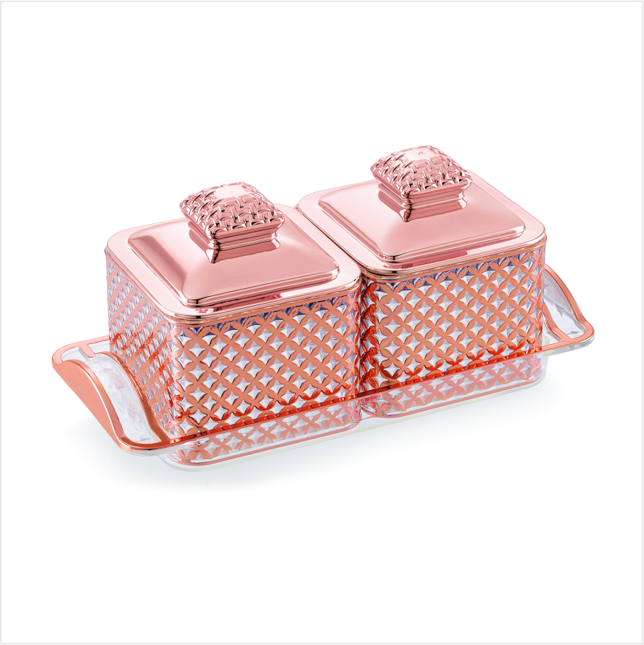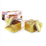 This elegant 2-container set includes a sleek, minimalist tray for convenient organization and display. Ideal for serving dry fruits, storing candies, or organizing small items on your desk or vanity.